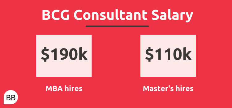 One of the key attractions of joining the Boston Consulting Group is the BCG consultant salary prospects awaiting successful candidates. An incoming master’s hire can expect a starting base salary of $110,000 at BCG. MBA graduates can expect a lucrative $190,000 per year as a starting salary. Both salaries are marginally ($2,000) lower than the equivalent for new starters at McKinsey and Bain.