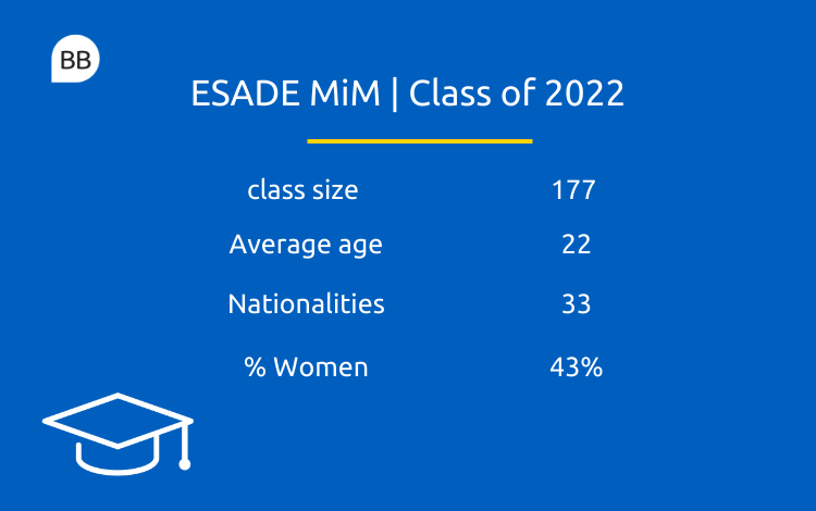 The school targets students with a broad range of backgrounds, skill sets, and career ambitions. The ESADE MiM cohort is comprised of 43% female, and spans across 33 nationalities, with 96% hailing from non-Spanish origins.
