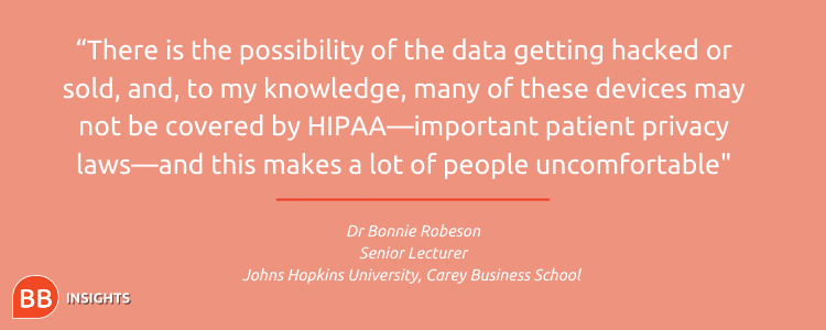 “There is the possibility of the data getting hacked or sold, and, to my knowledge, many of these devices may not be covered by HIPAA—important patient privacy laws—and this makes a lot of people uncomfortable,” Bonnie explains.