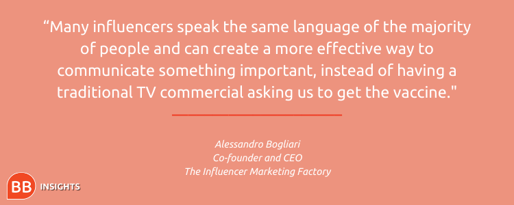 “Many influencers speak the same language of the majority of people and can create a more effective way to communicate something important instead of having a traditional TV commercial asking us to get the vaccine,” believes Alessandro Bogliari, co-founder, and CEO of The Influencer Marketing Factory.