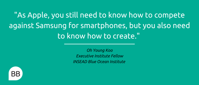 Moving into a blue ocean doesn’t mean leaving the red ocean behind though, warns Oh Young. “As Apple, you still need to know how to compete against Samsung for smartphones,” she says, “but you also need to know how to create.”