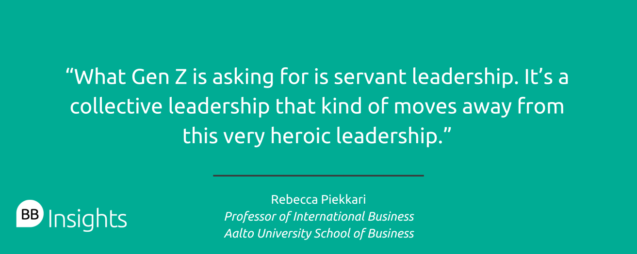 “What Gen Z is asking for is servant leadership. It’s a collective leadership that kind of moves away from this very heroic leadership, where you would have one strong leader, but it's very much sort of a shared activity,” she says.