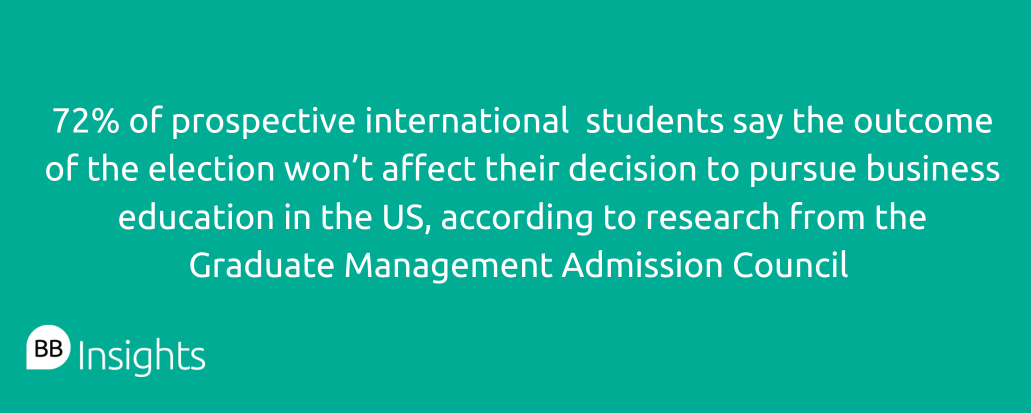This indifference is supported by research from Graduate Management Admissions Council (GMAC), which shows 72% of prospective international students don’t think the election will affect their decision to pursue business education in the US.
