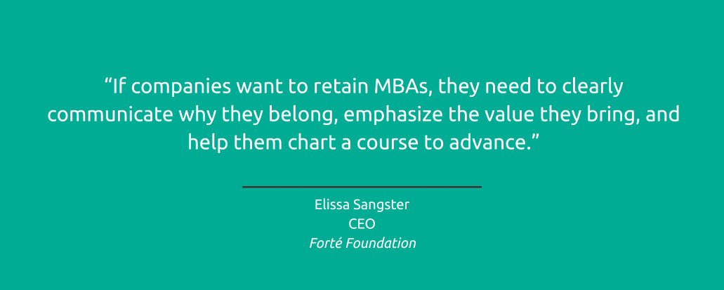 As the Forté report revealed, one of the greatest barriers facing female and minority MBAs today is the lack of sponsorship and formal mentorship opportunities available to them. Without these opportunities, both women and underrepresented minorities feel unsupported, lacking clear routes to advance in their careers.