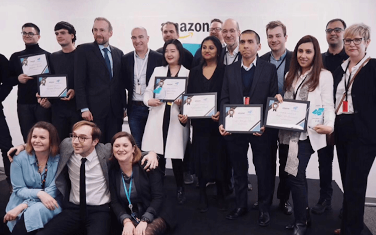 First, the Amazon Innovation Challenge. University students from around the world compete to offer a solution for one of Amazon’s real goals, a supply chain ambition to eliminate carbon emissions. Difei’s team (pictured above) finished first in France, presenting in front of Amazon’s VP for supply chain in France.