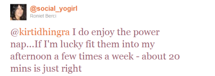 While the above shows an actual facebook conversation showcasing the normal perception of a power nap, tweeps on twitter reacted in different ways. Some of them were offended when asked the question "Please comment on what do you think about a power nap. Do you think it should be more widely accepted ?".